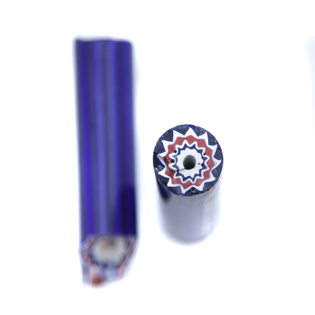 The sections in this collection range from 1 to 3 inches of usable length and feature the naturally uneven, fractured ends typical of century-old cane breakage. This roughness is part of their authenticity; the glass was never cut with modern tools, and age has further contributed to their irregular profiles. The bold starburst pattern—white, red, and navy encased in deep cobalt—is visible on every cross-section, making these pieces ideal for collectors, artists, carvers, and anyone seeking genuine antique Venetian chevron material for beads, pendants, scrimshaw-style carving, or display.