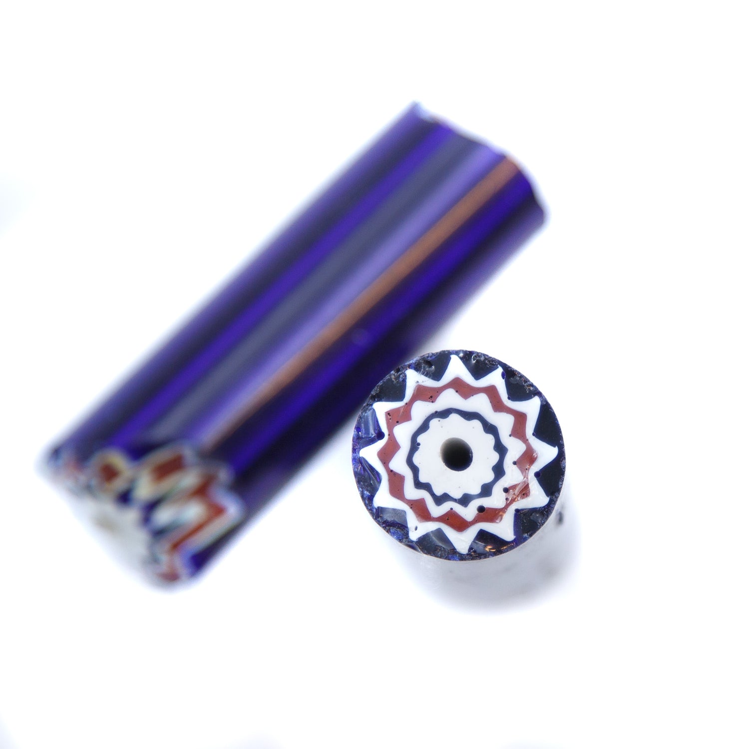 SV519-1: This chevron cane piece displays the classic Venetian rosetta pattern in 4–5 distinct layers, slightly earlier and rarer than the later 6-layer styles. Crafted in Murano between the late 1800s and early 1900s, the cane was hand-constructed from colored glass layers before being drawn into rods and later broken down into shorter sections. The ends are irregular and chipped, consistent with antique cane breakage after long-term storage. Perfect for collectors, small carved pieces, jewelry components, or historical study. 15-20mm in diameter. 2 Inch usable length average.