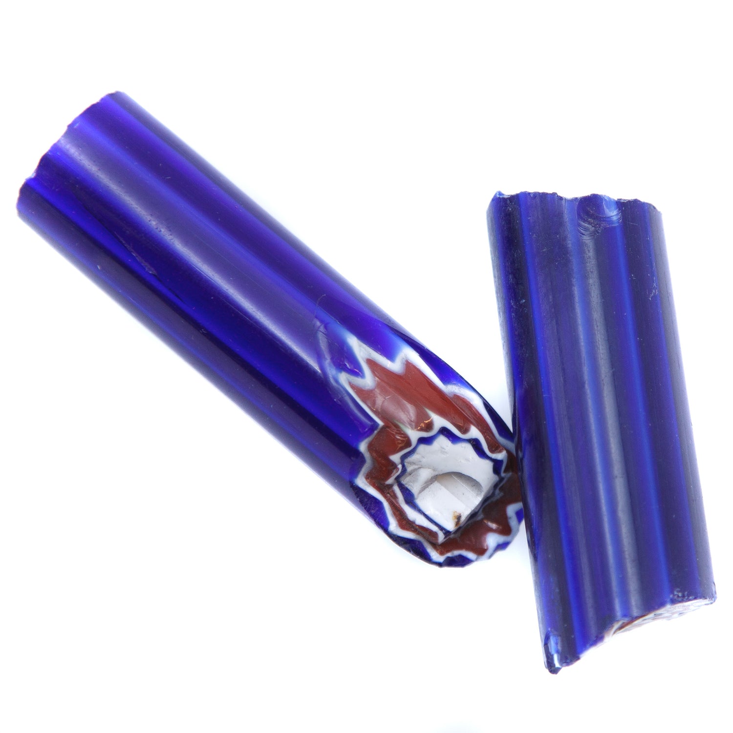 Detailed Description: This longer 3-inch antique chevron cane segment offers generous material for beadmaking or carving. Made in Murano during the late 19th century, it features the traditional multi-layer rosetta construction: a star-shaped white, navy, and red core encased within rich cobalt glass. The cane ends are rough and uneven from historical breakage, which is typical of authentic antique chevron rods. Excellent for artisans, collectors, and anyone preserving early Venetian glasswork.