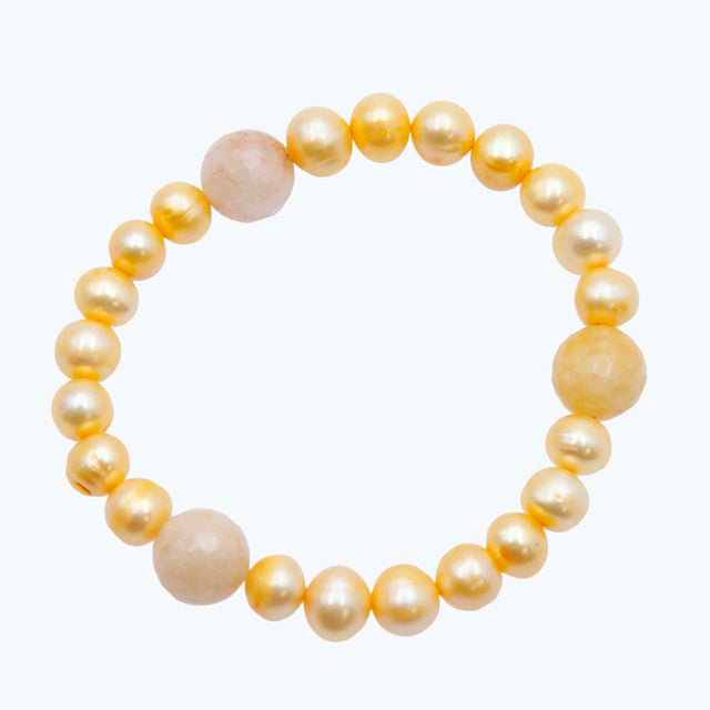 Stretch Bracelet - Single Strand - 8-9mm Peach Freshwater Pearls with three 12mm Global Faceted Round Aventurine Focal Beads
