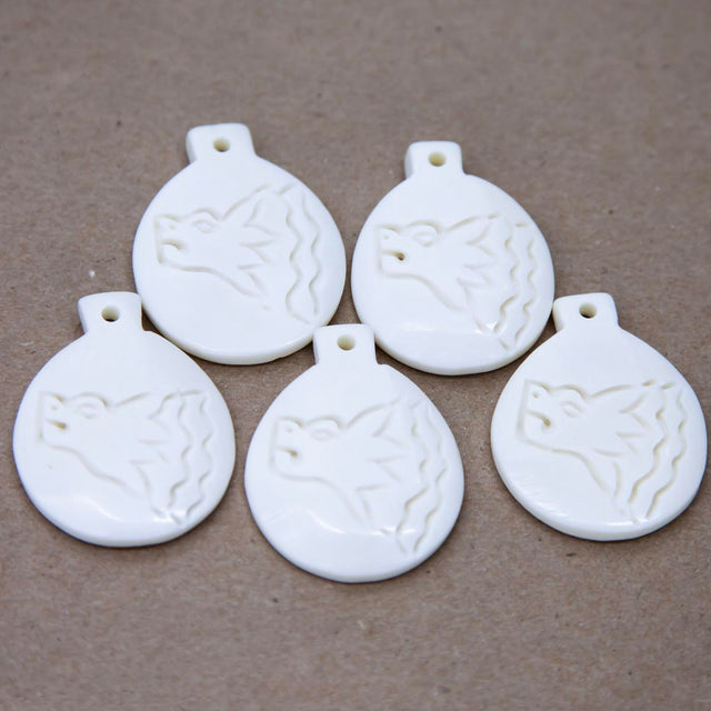 BN385-92: Bone Wolf Head Pendant White 44x35mm - 5 Pieces