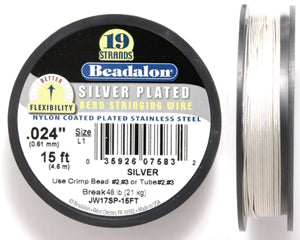 Detailed Description: Combine the flexibility and strength of Beadalon 19 Strand Beading wire with the luster of precious metal. Supple 19 strand stainless steel is plated with Silver, then coated with clear soft nylon. Brilliant Silver plated wire perfectly coordinates with sterling silver or silver plated findings.