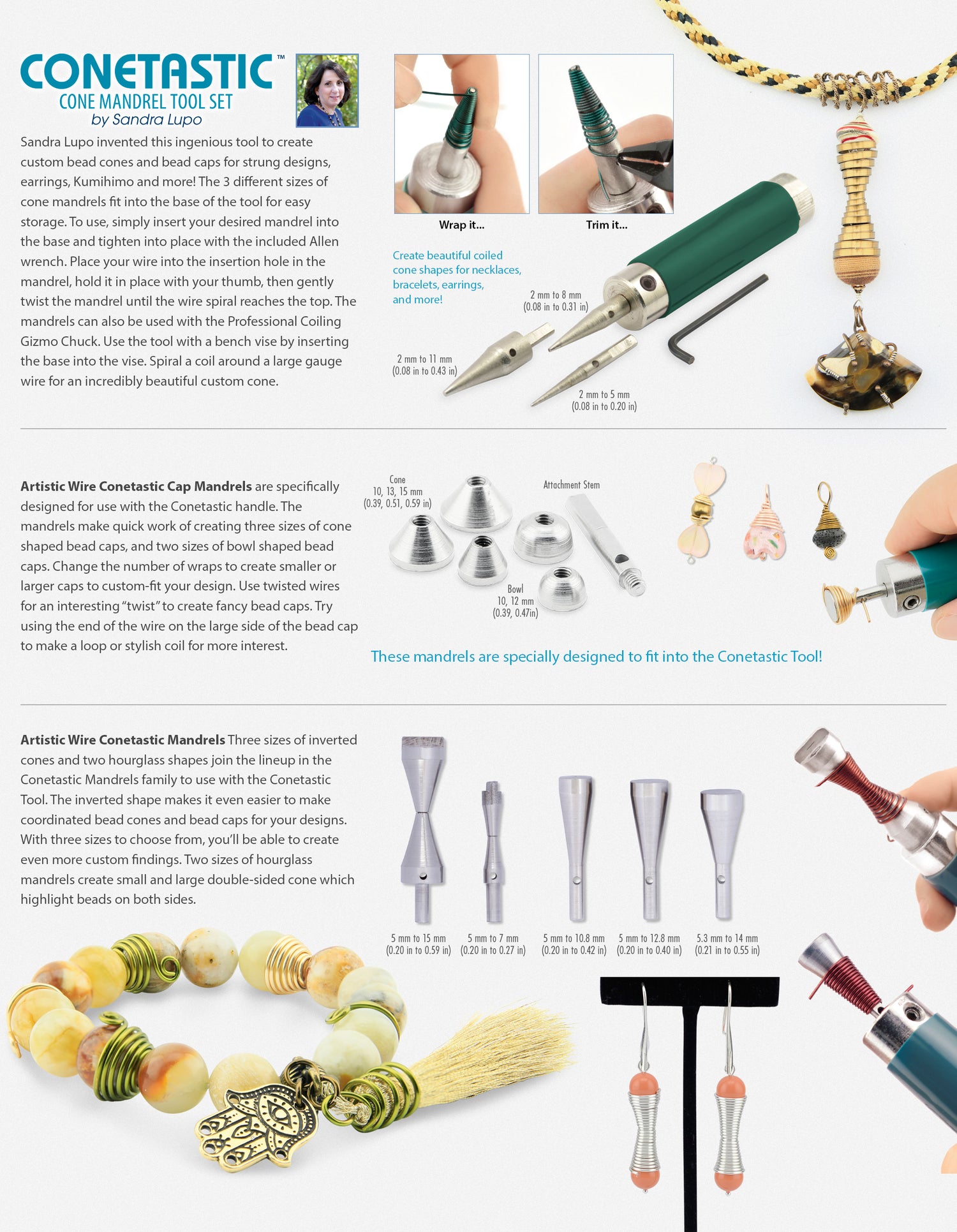 Detailed Description: Sandra Lupo invented this ingenious tool to create custom bead cones and bead caps for strung designs, earrings, Kumihimo and more! The 3 different sizes of cone mandrels fit into the base of the tool for easy storage. To use, simply insert your desired mandrel into the base and tighten into place with the included allen wrench. Place your wire into the insertion hole in the mandrel, hold it in place with your thumb, then gently twist the mandrel until the wire spiral reaches the top.